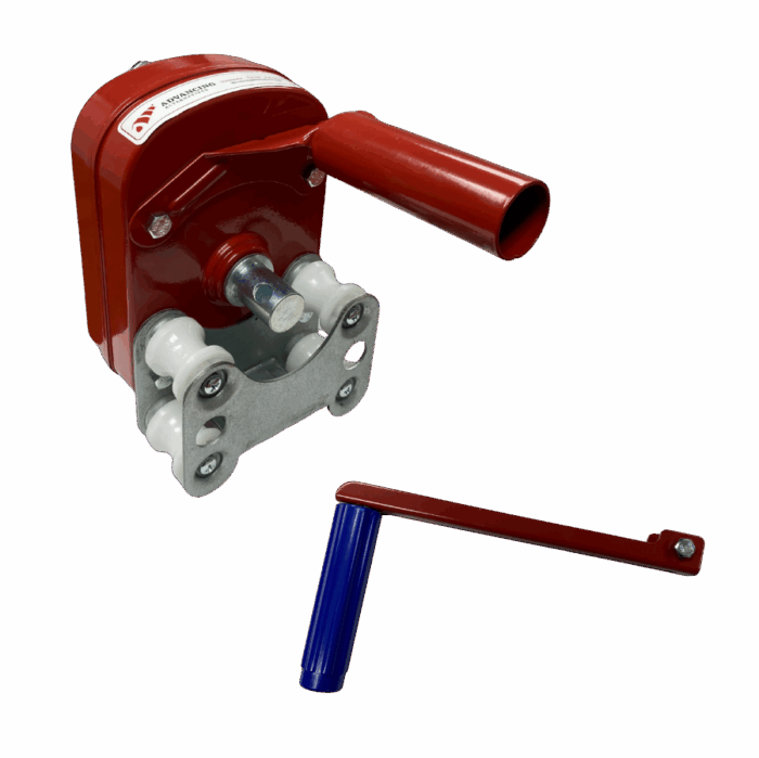 Gear Crank 5:1 gear box with internal brake, hand crank & 4 wheel roller guide. *Requires 1″ guide pipe* (order guide pipe and adapter separately)